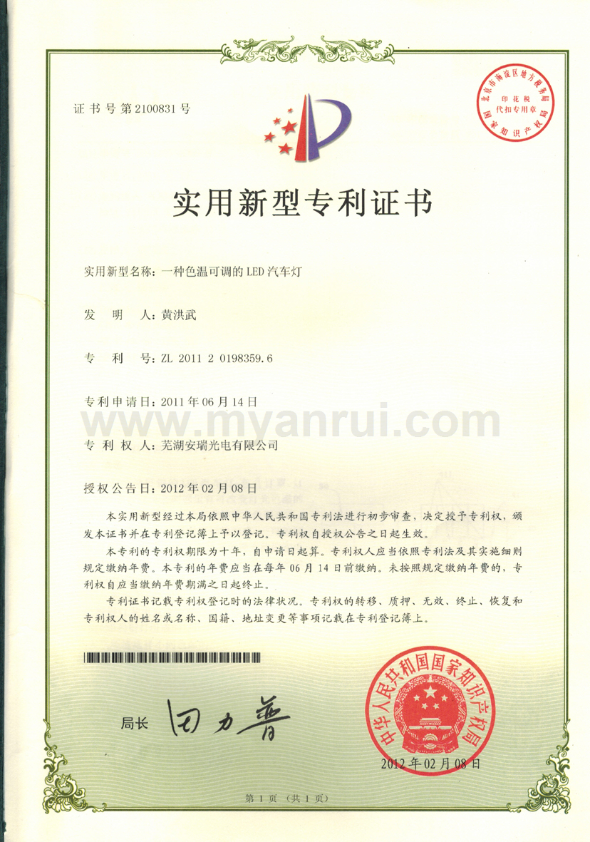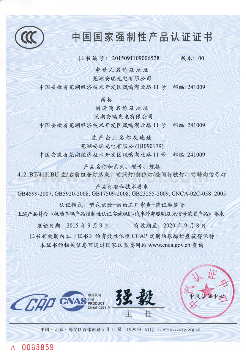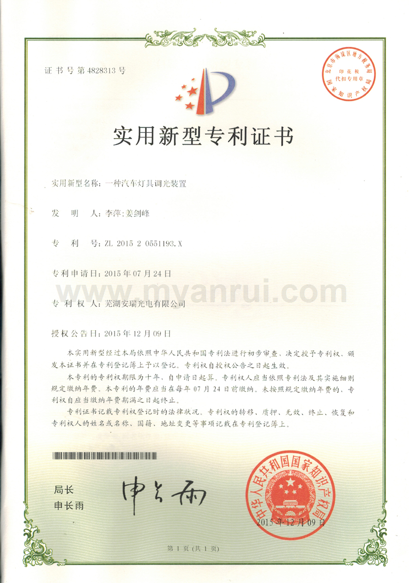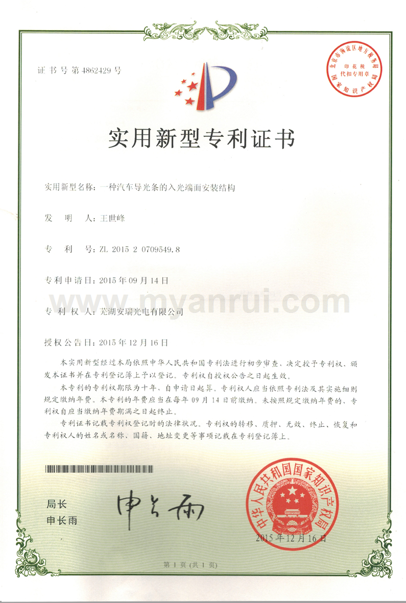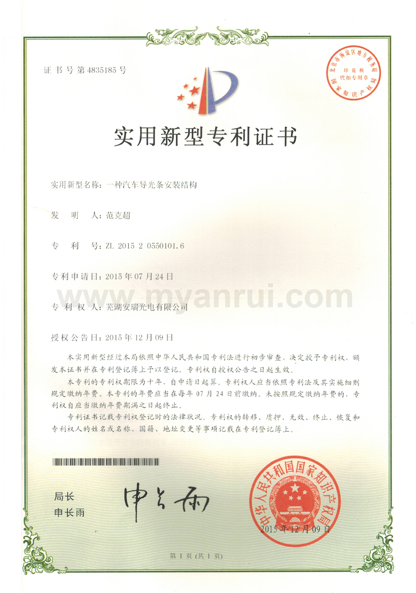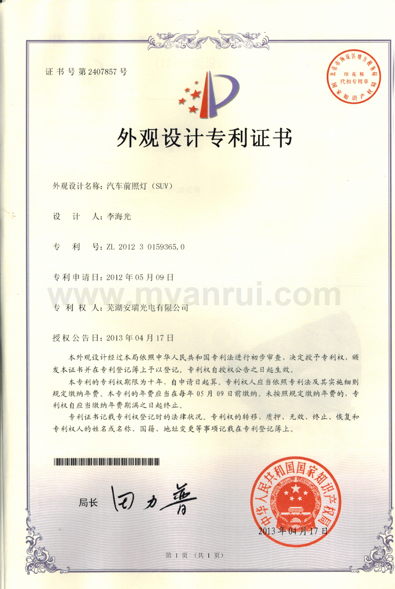 科技成果 1、公司获得专利 (1)专利证书----色温可调的LED汽车灯 专利号:ZL 2011 2 0198359.6 (2)专利证书----LED头灯冷却水散热装置 专利号:ZL 2011 2 0194834.2 (3)专利证书----高效率LED汽车近光前照灯 专利号:ZL 2011 2 0201513.0 (4)专利证书----一种超薄LED筒灯 专利号:ZL 2012 2 0347976.2 (5)外观设计专利证书----汽车前照灯(SUV) 专利号:ZL 2012 3 0159365.0 (6)实用新型专利证书----LED路灯 专利号:ZL 2013 2 0414532.0 (7)获得新型专利证书-一种汽车灯具调光装置 专利号:ZL 2015 2 055 1193.X (8)获得新型专利证书-一种防水线束连接头 专利号:ZL 2015 2 0020032.8 (9)获得新型专利证书-一种车灯线束密封结构 专利号:ZL 2015 0 0020033.2 (10)获得新型专利证书-一种汽车导光条的入光端面安装结构 专利号:ZL 2015 2 0709549.8 (11)获得一种汽车导光条安装结构-一种汽车导光条安装结构 专利号:ZL 2015 2 0550101.6 2、获得3C认证证书 (1)中国国家强制性产品认证证书 证书编号:2015091109006528 6、获得高新技术企业证书 证书编号:GR201434000815 7、2017年4月获得环境体系认证证书 证书编号:00117E20381ROM/3400 8、2017年4月获得职业健康安全管理体系认证证书 证书编号:00117S20256ROM/3400 |